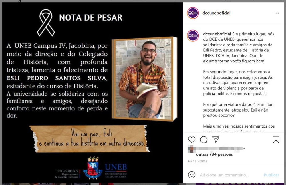 Amigos de Esli questionam a versão da Polícia Militar. O Diretório Central dos Estudantes (DCE) da Uneb afirmou que as narrativas sugerem um ato de violência por parte da PM.