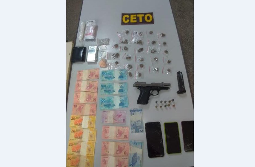 Na ação foi apreendido um adolescente de 17 anos, iniciais J.F. dos S., acusado de liderar o tráfico na localidade e em seu poder foi apreendido: uma pistola Taurus, calibre 380, modelo 58S, numeração suprimida, com um carregador e dez munições do mesmo calibre; 109 porções de uma substância com aparência de crack; uma pedra grande da mesma droga; 25 porções de uma substância com aparência de maconha; duas porções de uma substância com aparência análoga a cocaína; uma balança de precisão; três celulares; R$ 459,00 em espécie e diversos sacos plásticos para embalagem de drogas.