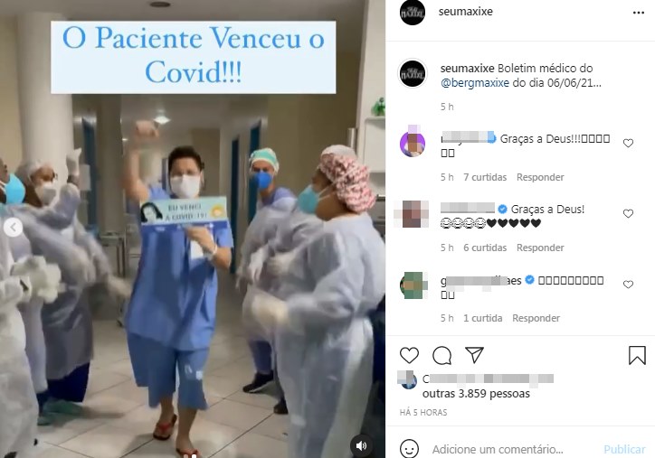 Na postagem, o cantor aparece em um vídeo ao lado da equipe médica, comemorando a alta hospitalar. O artista testou positivo para a Covid-19 e depois foi internado em um hospital de Salvador, que não teve o nome divulgado, na última terça-feira (1).
