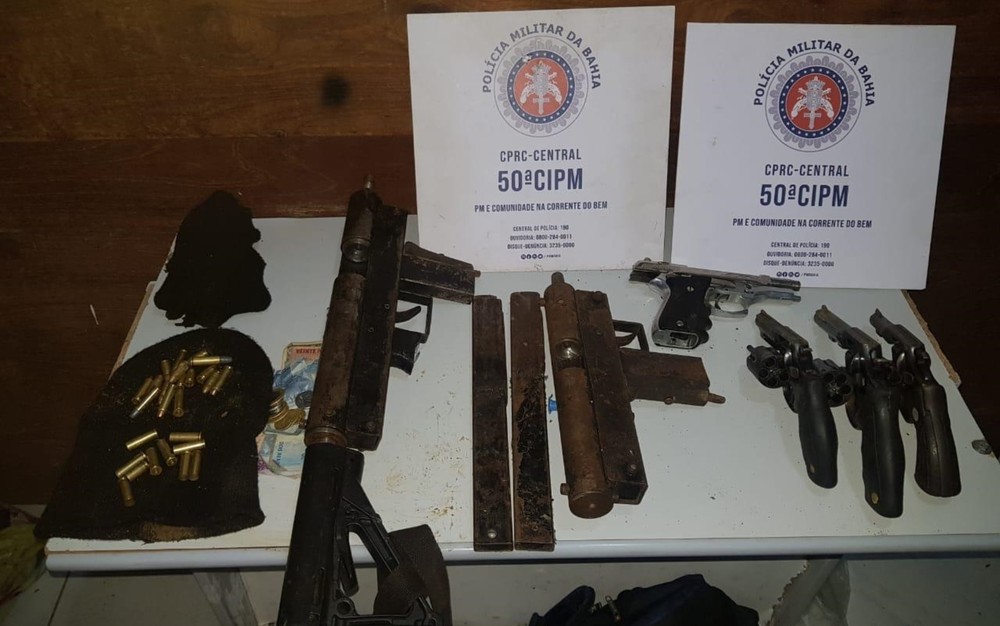 Na ocasião, foram apreendidos com os suspeitos duas metralhadoras artesanais, uma pistola de calibre 380, três revólveres de calibre 38, quatro granadas caseiras, 161 pedras de crack, 155 pinos de cocaína, 20 pesos argentinos, um dólar americano e R$ 50,30.