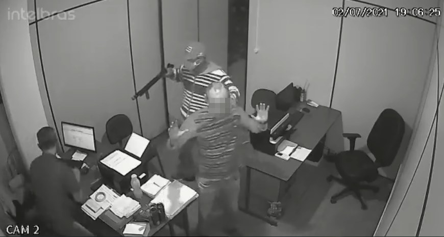 Em outro vídeo (não disponível) mostra que os bandidos chegaram em um Chevrolet Corsa, estacionam em frente ao estabelecimento e entram no local andando tranquilamente, com as armas na mão.