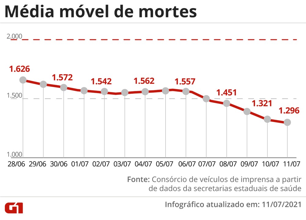 De 17 de março até 10 de maio, foram 55 dias seguidos com essa média móvel de mortes acima de 2 mil. No pior momento desse período, a média chegou ao recorde de 3.125, no dia 12 de abril.