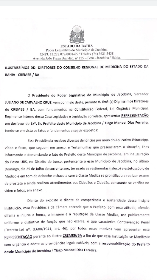 Ainda de acordo com o site, a motivação da denúncia se origina em um vídeo gravado durante a inauguração da UBS 24 horas do Distrito do Junco, onde o gestor do município aparece vestido de Jaleco de médico e estetoscópio, o que, segundo a denúncia, configura-se crime de Contravenção Penal. O presidente da Câmara alega também que o prefeito teria, em tom de suposto deboche e chacota, se prontificado a realizar exame de próstata nos presentes.
