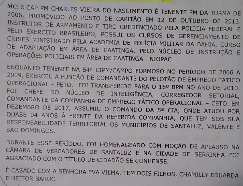 Capitão Charles disse que recebe com muita satisfação o comando da 4ª Cia depois de quase 4 anos frente a 5ª Cia, entende que foi uma decisão administrativa do Comando do 16º BPM em Serrinha e do Regional Leste e disse que dará continuidade ao trabalho de Laerth, assim com ele (Laerth) fará em Santaluz o que ele iniciou, “tudo em prol da segurança pública”, disse.