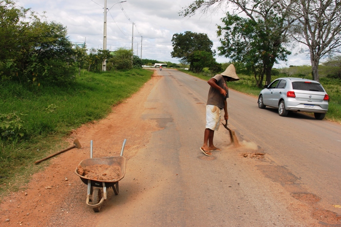Os motoristas sofrem as consequências da estrada ruim e um cidadão fatura alguns trocados fazendo um paliativo| Foto: Raimundo Mascarenhas
