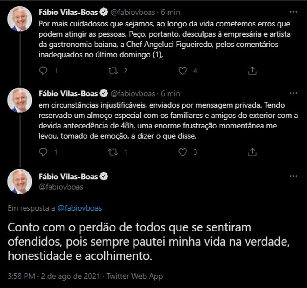 “Por mais cuidadosos que sejamos, ao longo da vida cometemos erros que podem atingir as pessoas. Peço, portanto, desculpas à empresária e artista da gastronomia baiana, a Chef Angeluci Figueiredo, pelos comentários inadequados no último domingo (1), em circunstâncias injustificáveis, enviados por mensagem privada”, disse Fábio Vilas-Boas.