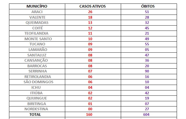 O município com a maior quantidade de casos ativos é Araci com 26, enquanto Nordestina estão com casos ativos zerados. Serrinha onde foi registrado mais óbitos e a segunda maior em casos positivos tem apenas 7 ativos. Coité com mais casos positivos aparece com 12.