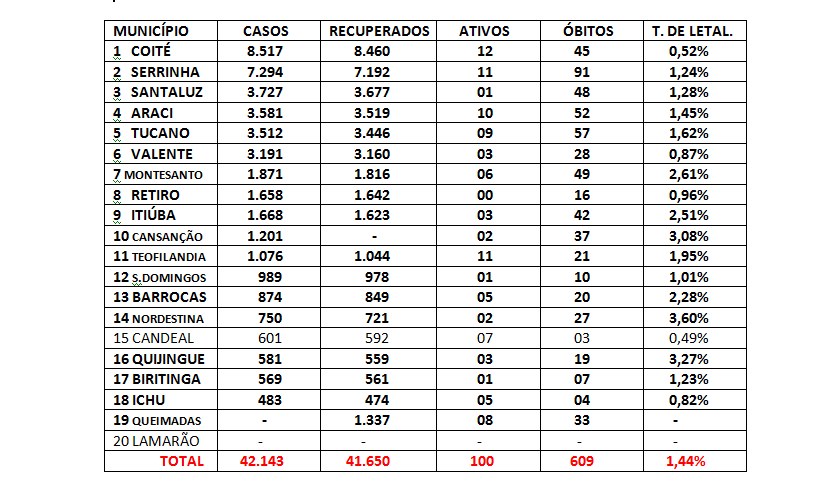 Dos 20 municípios quatro não estão atualizados o que impede o total exato dos números. A começar por Lamarão que desde o começo da pandemia jamais publicou um boletim da covid em rede social; Candeal desistiu de publicar e estamos usando os mesmos números dos últimos dois meses; Queimadas nunca publica os casos positivos, opta para divulgar os demais dados (recuperados, ativos e óbitos); Teofilândia que publicou o ultimo em 24/08 e Quijingue 03/09.