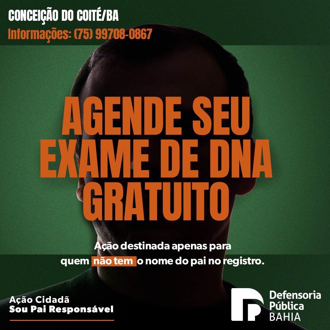 Nesta segunda e terça-feira, 27 e 28, a Defensoria Pública do Estado da Bahia (DPE-BA) em Conceição do Coité, realizará um mutirão de exames de DNA dentro da Ação Cidadã Sou Pai Responsável, desenvolvida para estimular homens a assumirem a paternidade de crianças sem registro.