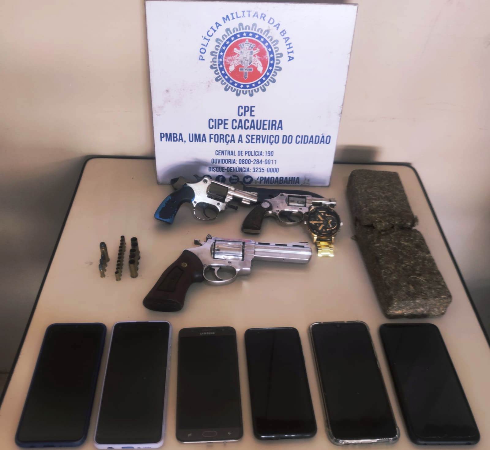 Com eles foram apreendidos três revólveres calibres 22 e 38, além de um quilo de maconha e seis celulares. Todos o material foi encaminhado para a Coordenadoria da Polícia Militar de Valença.