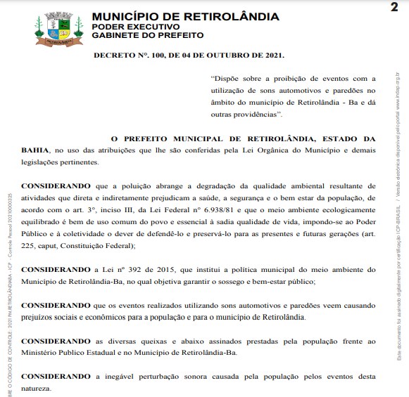 Foi publicado na edição do Diário Oficial do Município de Retirolândia de segunda-feira, 06, o Decreto de número 100, que proíbe a realização de festa com uso de som paredão em todo território municipal seja em área pública ou privada.