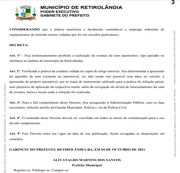 Segundo o decreto os eventos realizados utilizando sons automotivos e paredões vêm causando prejuízos sociais e econômicos para a população e para o município de Retirolândia e que há diversas queixas e abaixo assinados prestadas pela população frente ao Ministério Publico Estadual e no Município de Retirolândia.