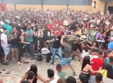 Um show terminou com muita pancadaria em uma casa de eventos em Juazeiro, na manhã deste domingo (31), durante apresentação do cantor Thiago Aquino. Vídeos que circulam nas redes sociais mostram uma briga generalizada e muita correria no espaço que estava lotado. Não há informações sobre feridos.