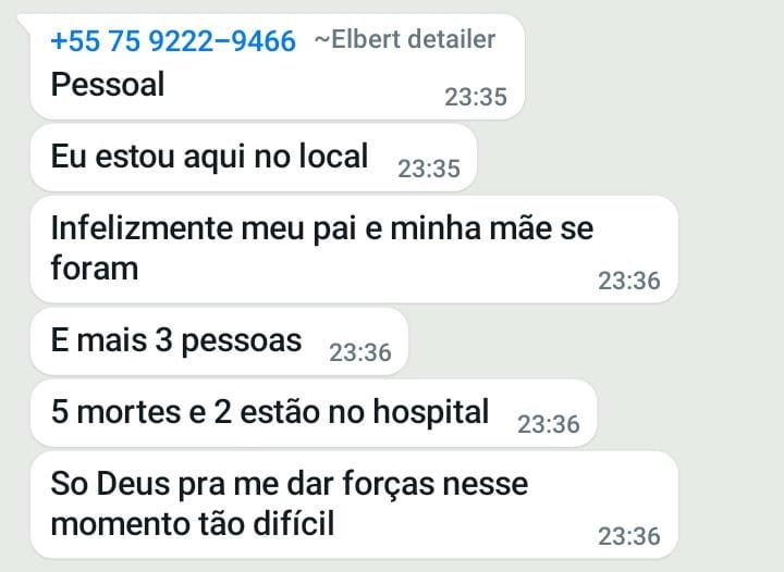 Uma pessoa passou esta mensagem para um grupo de Riachão do Jacuípe lamentando ocorrido e diz ser filho do casal.