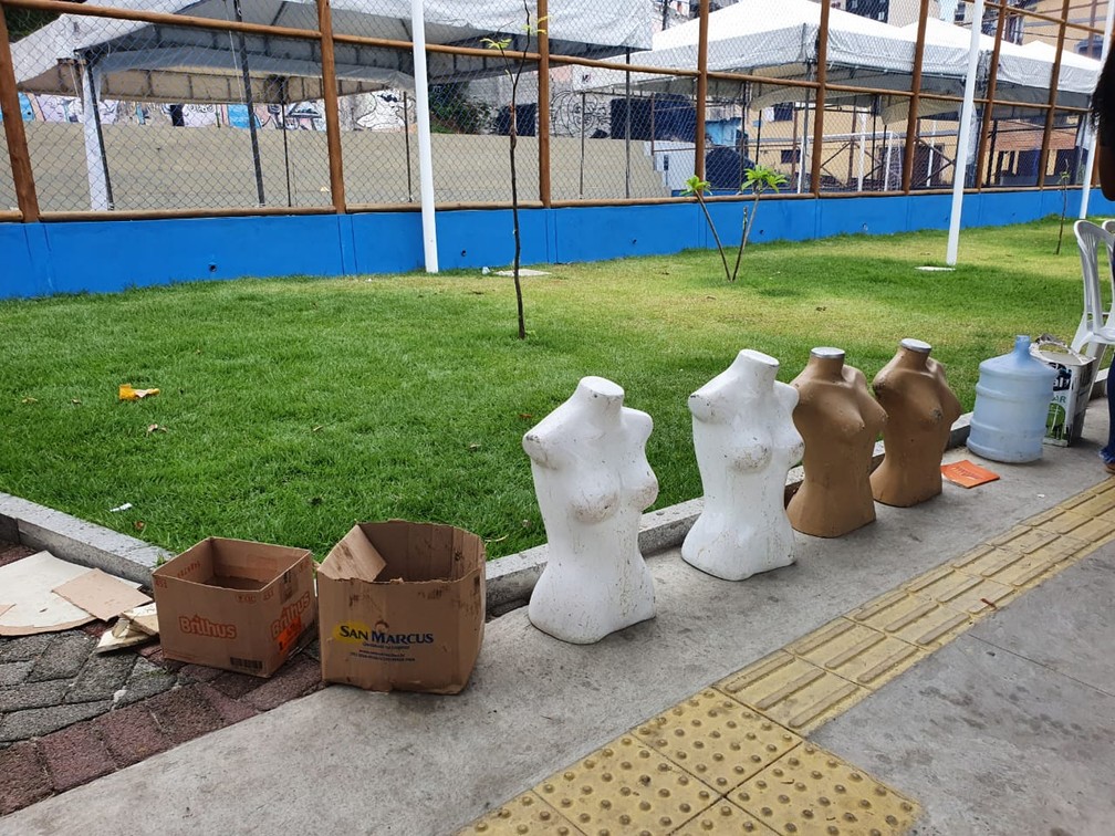 Beneficiários usam manequins para guardar vaga em fila de recadastramento do CadÚnico