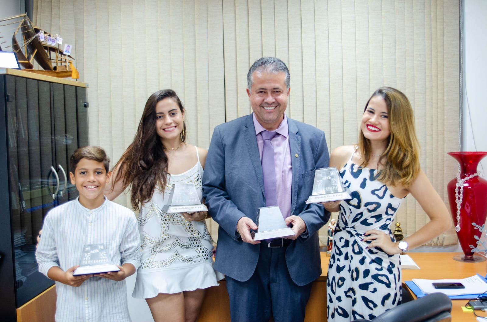 Deputado Alex segura troféu atual, enquanto cada filho segura dos anos anteriores