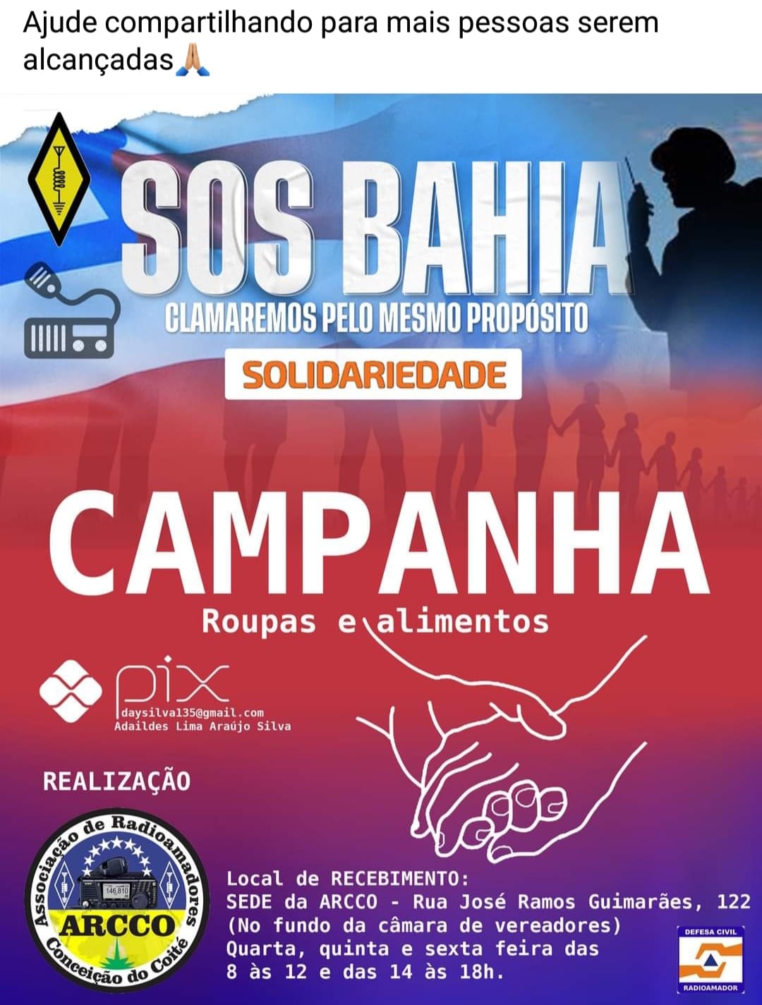 A Associação dos Radioamadores de Conceição do Coité (ARCCO) iniciou nesta quarta-feira, 29, uma campanha de arrecadação de alimentos, água mineral, roupas, calçados, material de limpeza, qualquer valor em dinheiro através do Pix, e outros itens que possam aliviar o sofrimento de milhares de desabrigados pela enchentes no Sul e extremo Sul do Estado da Bahia.