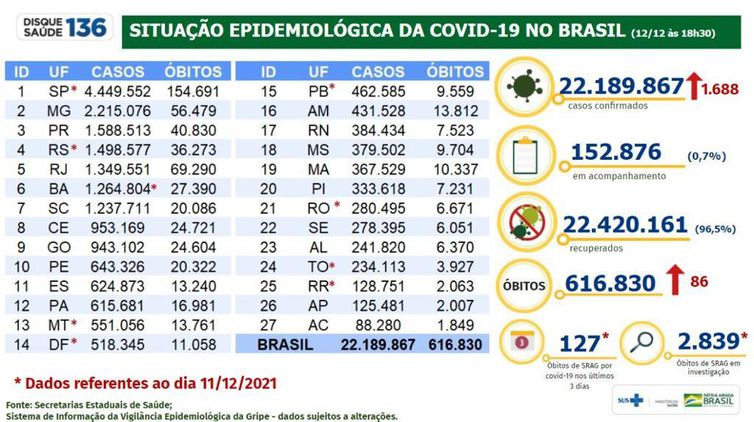 De acordo com levantamento feito pela pasta, o Brasil tem, no acumulado, 22,189 milhões de casos confirmados da doença, que já matou 616.830 pessoas.