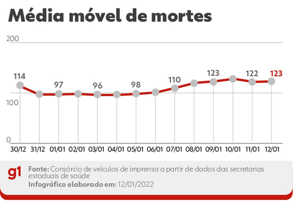 O país também registrou 138 mortes pela Covid-19 nas últimas 24 horas, totalizando 620.419 óbitos desde o início da pandemia. Com isso, a média móvel de mortes nos últimos 7 dias é de 123. Em comparação à média de 14 dias atrás, a variação foi de +7%, indicando tendência de estabilidade nos óbitos decorrentes da doença.