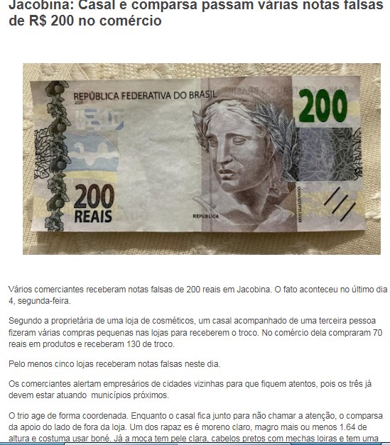 Um repórter de Jacobina que tinha feito uma reportagem recente sobre um casal e um homem que teria agido da mesma maneira naquela cidade, entrou em contato com nossa redação ainda na noite desta quinta informando que muito provavelmente este individuo detido em Coité usou da mesma pratica para causar prejuízos a vários comerciantes, ou seja, pagava com nota de 200 reais falsa para receber o troco.