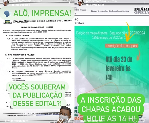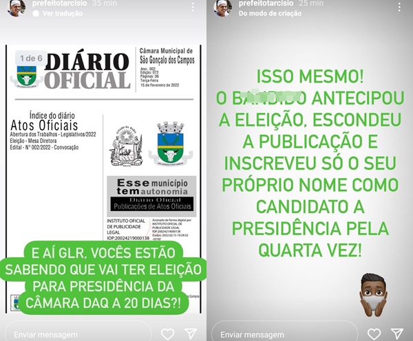 “Isso mesmo! Antecipou a eleição, escondeu a publicação e somente escreveu seu próprio nome à presidência da Câmara pela quarta vez”, postou o prefeito, Tarcísio Pedreira, em seus stories no Instagram.
