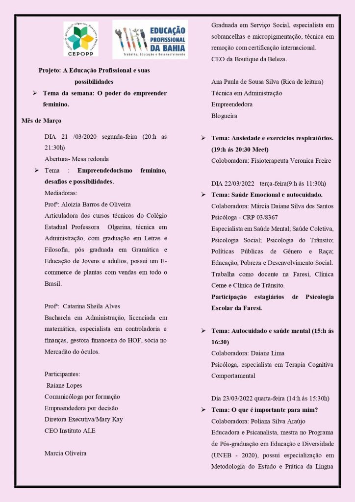O Colégio Estadual Professora Olgarina Pinheiro em Conceição do Coité impulsionado pelo Março Mulher, realiza uma semana voltada para o empreendedorismo feminino, tendo como tema “O poder do empreender feminino”.
