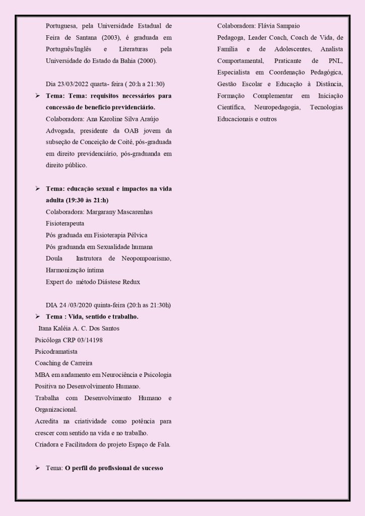 Ainda de acordo com a educadora, durante a semana contará com a participação de profissionais como psicólogos, fisioterapeutas, empreendedoras, advogadas, psicanalistas, leadercoaching, pedagoga, todos com o intuito maior de contribuir com a as suas experiências e conhecimentos para futuros profissionais técnicos. “Nesse momento inicial iremos abordar mais de forma ampla e teórica sobre o empreendedorismo e teremos como público alvo somente nossos alunos do curso técnicos que dispomos em nossa instituição dos cursos de Administração, Recursos Humanos, Informática e Segurança do trabalho”, ressaltou Aloizia.