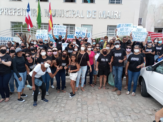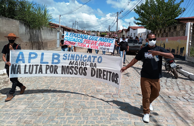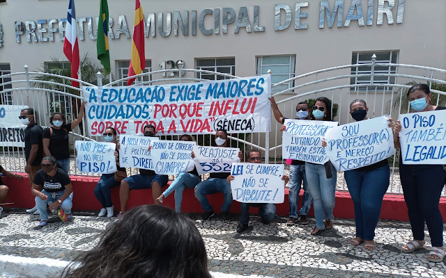Dezenas da professores da rede municipal de ensino de Mairi, município do território da Bacia do Jacuípe e demais trabalhadores da educação se reuniram na manhã desta terça-feira, 08, na Sede da APLB Sindicato de onde saíram em passeata pelas ruas da cidade como forma de manifestação e protesto ao descumprimento por parte do poder público municipal do artigo 5º da Lei nº 11.738/08.