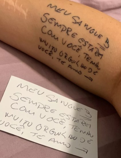 “Eu decidi tatuar esse bilhete na última segunda-feira, mas eu já ia fazer algumas outras tatuagens que eu e a minha mãe passamos com ele”. Uma delas é esse bilhete que o pai da jovem lhe deixou como presente: “Meu sangue B, sempre estarei com você, tenho muito orgulho de você, te amo”.