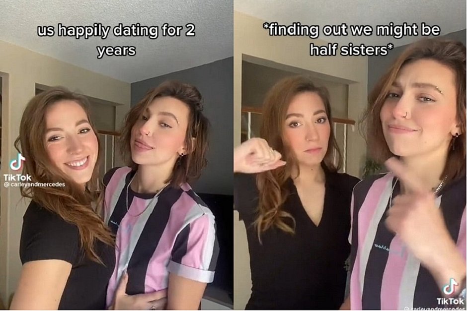 Um casal de namoradas do Canadá descobriu que elas podem ser meia-irmãs. A dúvida surgiu quando as duas descobriram que um mesmo homem teve relacionamento com as mães das duas. Carley e Mercedes namoram há dois anos e contaram a história no TikTok, segundo o New York Post.