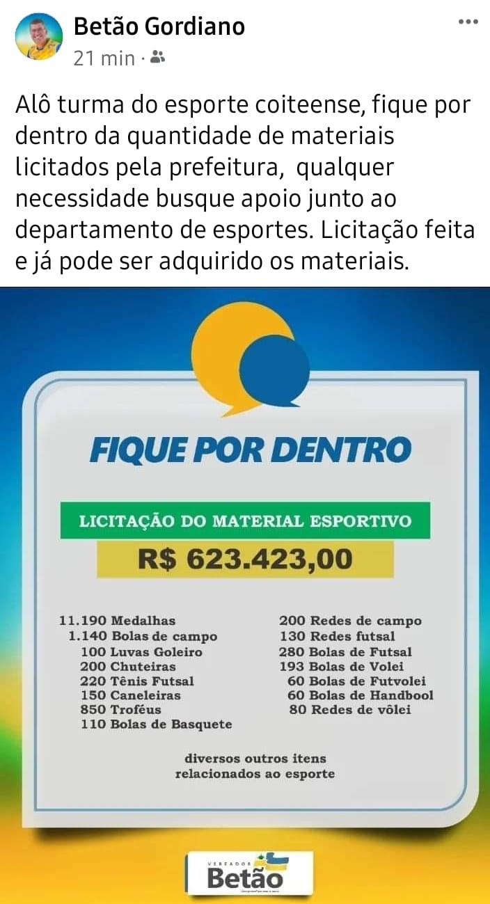 O presidente da Câmara Municipal, Adalberto Neres Pinto Gordiano, popularmente conhecido Betão, tem adotado o novo normal para divulgar as ações do seu mandato e os investimentos do município através de um card padronizado denominado Fique Por Dentro e nesta edição ele traz o informativo desta aquisição de vários itens de material esportivo, com destaques para 11.190 medalhas, 1.140 bolas de futebol de campo e 850 troféus.