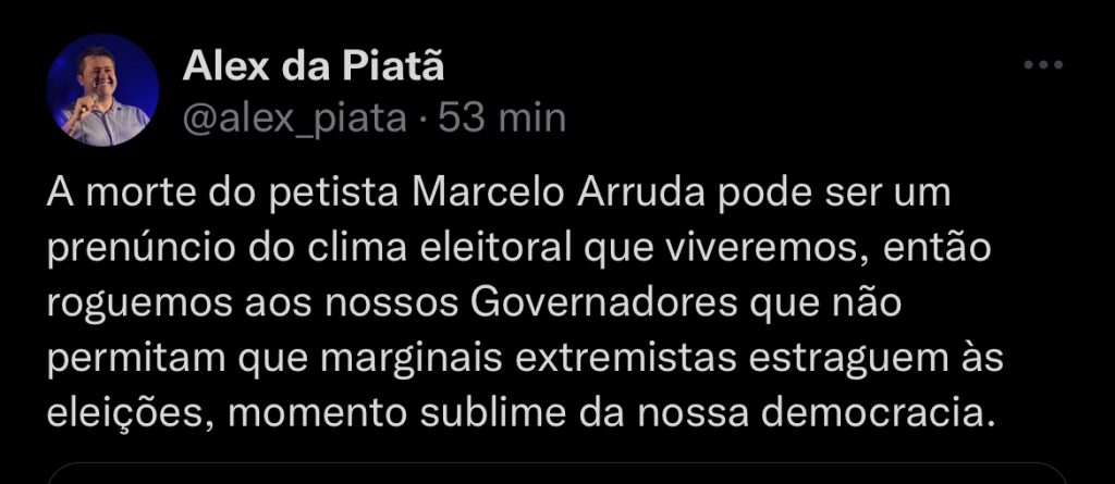 “A morte do petista Marcelo Arruda pode ser um prenúncio do clima eleitoral que viveremos, então roguemos aos nossos Governadores que não permitam que marginais extremistas estraguem às eleições, momento sublime da nossa democracia”, publicou na sua conta do Twitter no início da noite deste domingo (10).