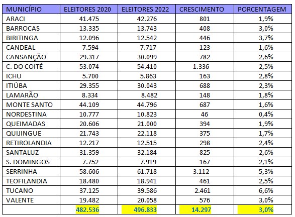 O Calila Notícias fez um levantamento do eleitorado dos 20 municípios que compõem o território do sisal e concluiu que terá 14.297 eleitores a mais, em relação as eleições municipais em 2020, aumento de 3%.