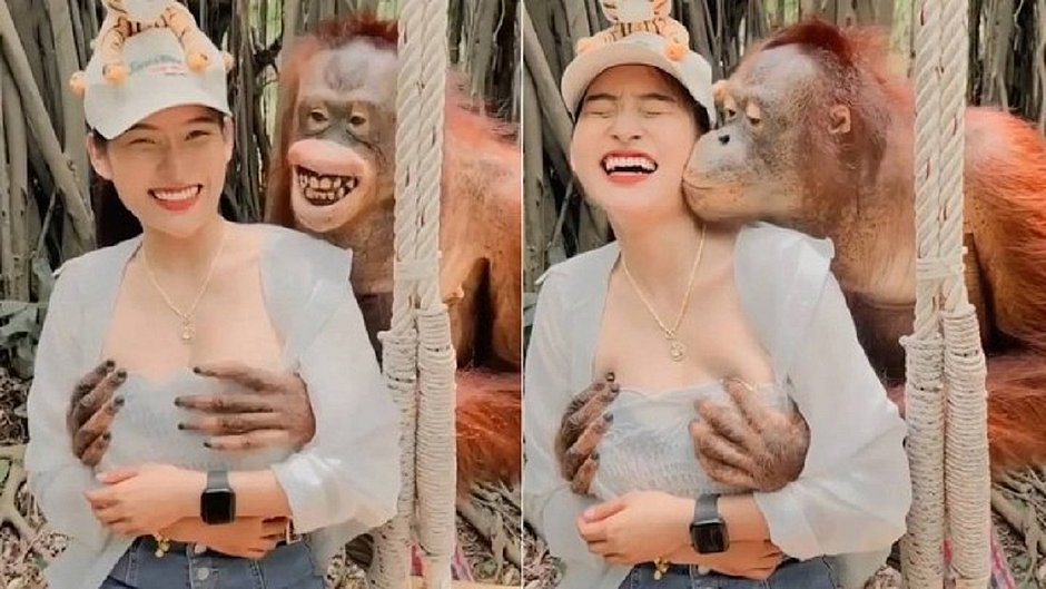 Um orangotango ‘assanhado’ se aproveitou de uma turista que parou para tirar foto com ele para apalpar os seios dela. O caso aconteceu no Safari World, parque em Bancoque, na Tailândia. As informações são do Correio