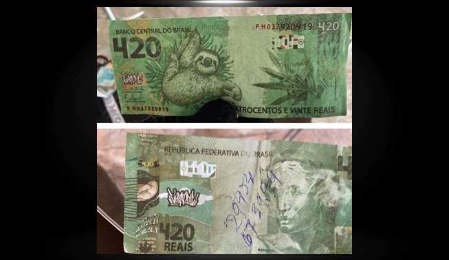“O que mais chamou atenção foram os desenhos de maconha e bicho-preguiça estampados na nota. No outro lado da cédula falsa, a efígie da república aparece soltando uma fumaça pela boca. Mesmo não havendo crime por não se tratar de falsificação, uma vez que a nota não existe, a cédula foi devidamente apreendida”, diz a nota da PF.