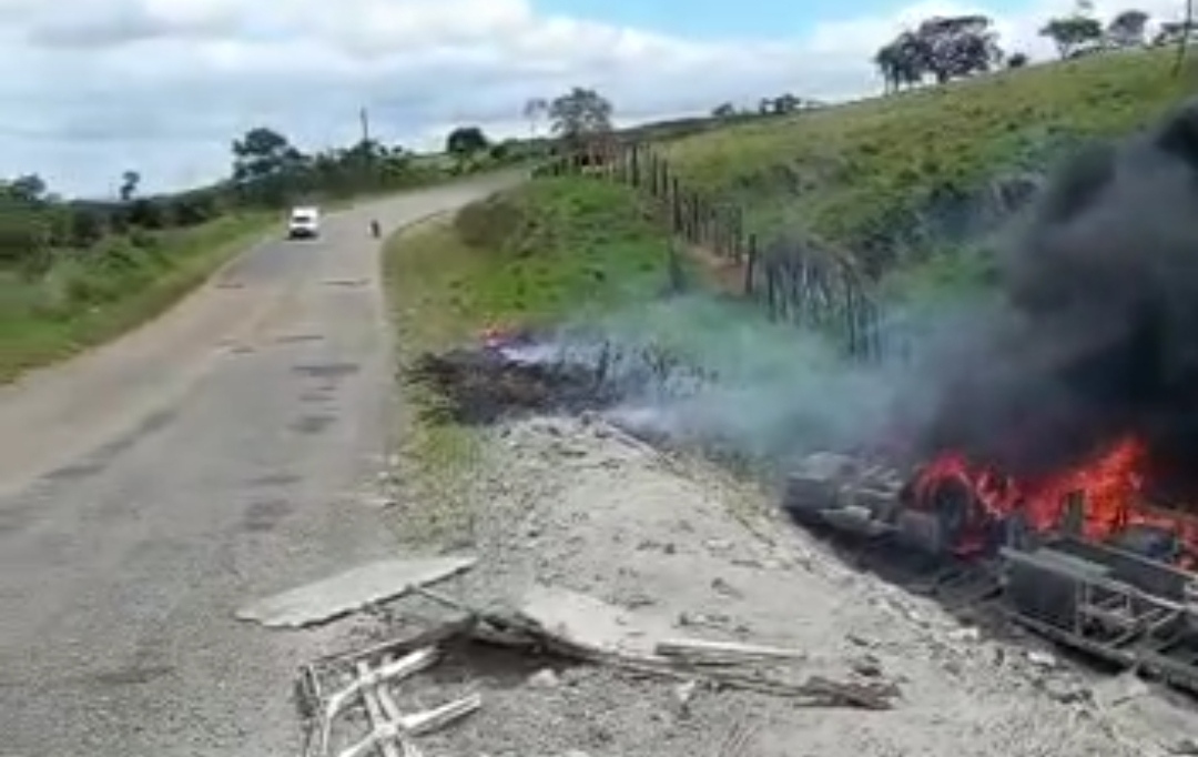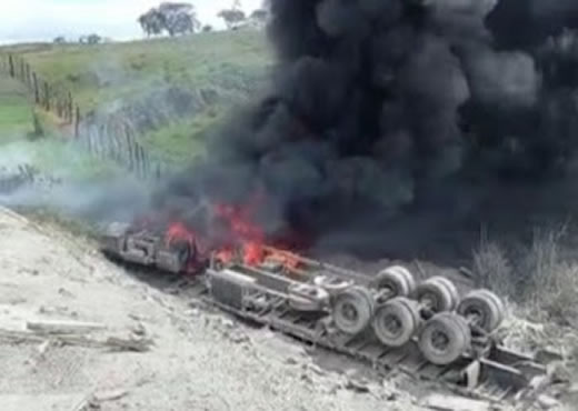 Uma carreta carregada com cimento saiu da pista, tombou e foi consumida pelo fogo no inicio da tarde desta terça-feira, 16, na BA-421 a cerca de 5 km de Mundo Novo, sentido Piritiba, na região da Chapada Diamantina.