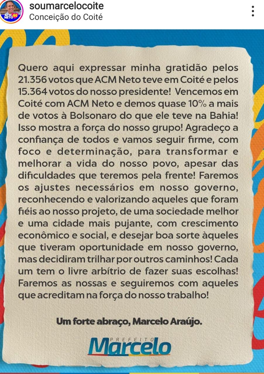 Os candidatos apoiados neste segundo turno pelo prefeito de Conceição do Coité, Marcelo Araújo (União Brasil), Jair Bolsonaro (PL) para presidente e ACM Neto (União Brasil) para o Governo da Bahia embora tenham sido derrotados, tiveram melhora na votação o que não deixa de ser um alento ao grupo do prefeito, afinal, do outro tinha o deputado Alex da Piatã (PSD) e o ex-prefeito Assis (PT) que estão com relações politicas rompidas no município, mas fizeram campanha para os mesmos candidatos, ou sejam, Jerônimo e Lula, porém o candidato petista não esteve em Coité durante toda campanha e a quem diga que o motivo foi justamente por conta do racha local, Neto virou no segundo turno.