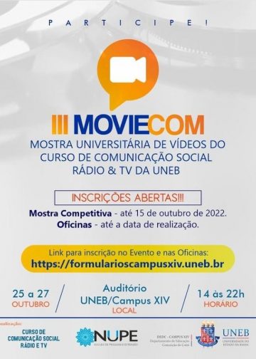 No próximo dia 25 (terça-feira), inicia-se a programação da III MovieCom-Mostra Universitária de Vídeos do Curso de Comunicação Social/Rádio e Tv da Universidade do Estado da Bahia(UNEB), Campus XIV, no município de Conceição do Coité. A atração ocorrerá no auditório da própria instituição à partir das 19h30 e irá até o dia 27 (quinta-feira), ocorrendo em turnos variados.