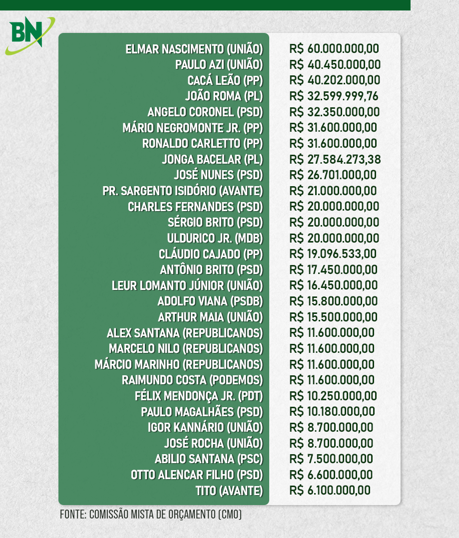 No quesito volume de recursos, como apurou o Bahia Notícias, parceiro do Calila, quem liderou a lista de indicações é o deputado Elmar Nascimento (União), que conseguiu a indicação de R$ 60.000.000,00 em emendas. O mais expressivo dos repasses, de R$ 40.000.000,00, deverá ser direcionado, conforme indicado, para a Prefeitura Municipal de Campo Formoso, no território do Piemonte Norte do Itapicuru, a fim de realizar a pavimentação asfáltica de ruas. A cidade é base política de Elmar.
