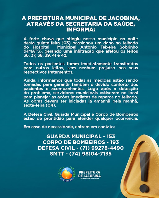 Pacientes do Hospital Antônio Teixeira Sobrinho de Jacobina sofreram com as últimas chuvas que caíram na cidade na noite de quinta. Imagens feitas por companhantes mostram vários pontos de alagamentos no interior do (HMATS). No registro mais preocupante, uma mulher diz que parte do forro caiu sobre o leito de um paciente acamado, porém ainda não há uma confirmação se a pessoa foi atingida.
