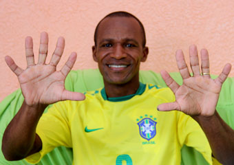 Veja a reportagem abaixo que traz o relato curioso de que a própria mãe só percebeu quando ele tinha seis meses de vida [um mês pra cada dedo], enfrentou problemas no trabalho que exigia uso de luvas, que são fabricadas pra cinco dedos, no momento que foi fazer documentos, tendo que sujar de tinta cinco dedos e a atendente ficou sem saber o que fazer com o sexto, e que omitiu o quanto pôde pra então namorada, hoje sua esposa Mônica.