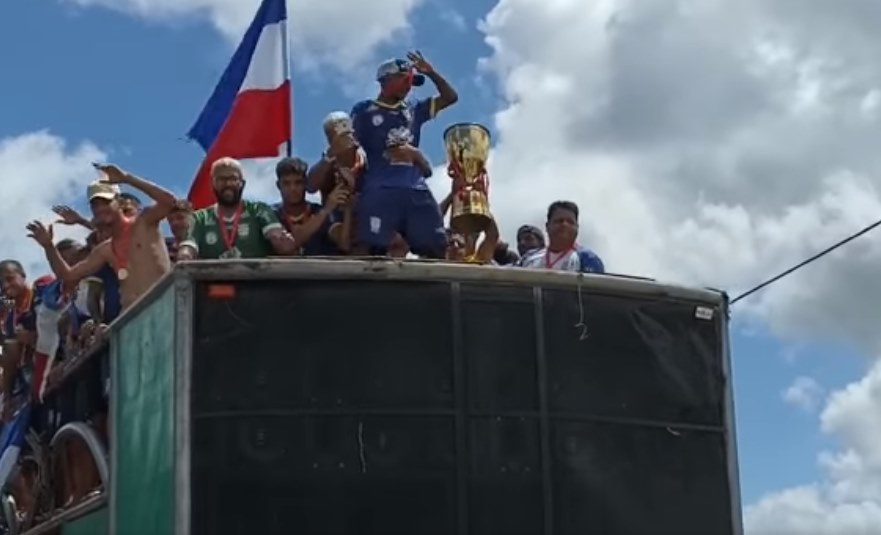 Em êxtase, o grupo desceu do ônibus e subiu em um mine-trio cercado por uma multidão que foi recepcionar a seleção na entrada da cidade. Veja o vídeo da TV Euclides