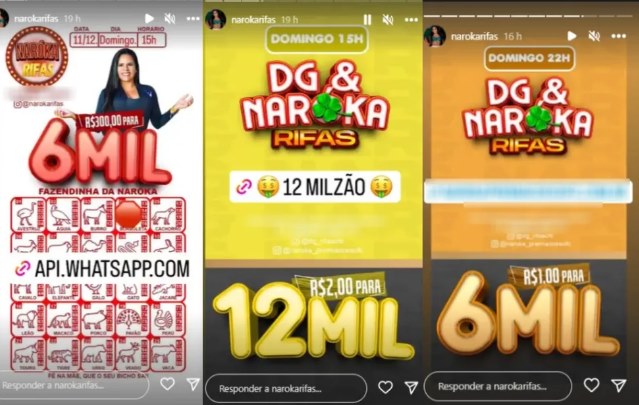 Nas redes sociais, o casal era conhecido pela venda digital de rifas. Naroka e DG compartilhavam prints de sorteios de R$ 6 mil e R$ 12 mil. Em um destaque fixado no Instagram da rifeira, é possível ver relatos de diversos ganhadores das rifas vendidas pelo casal.