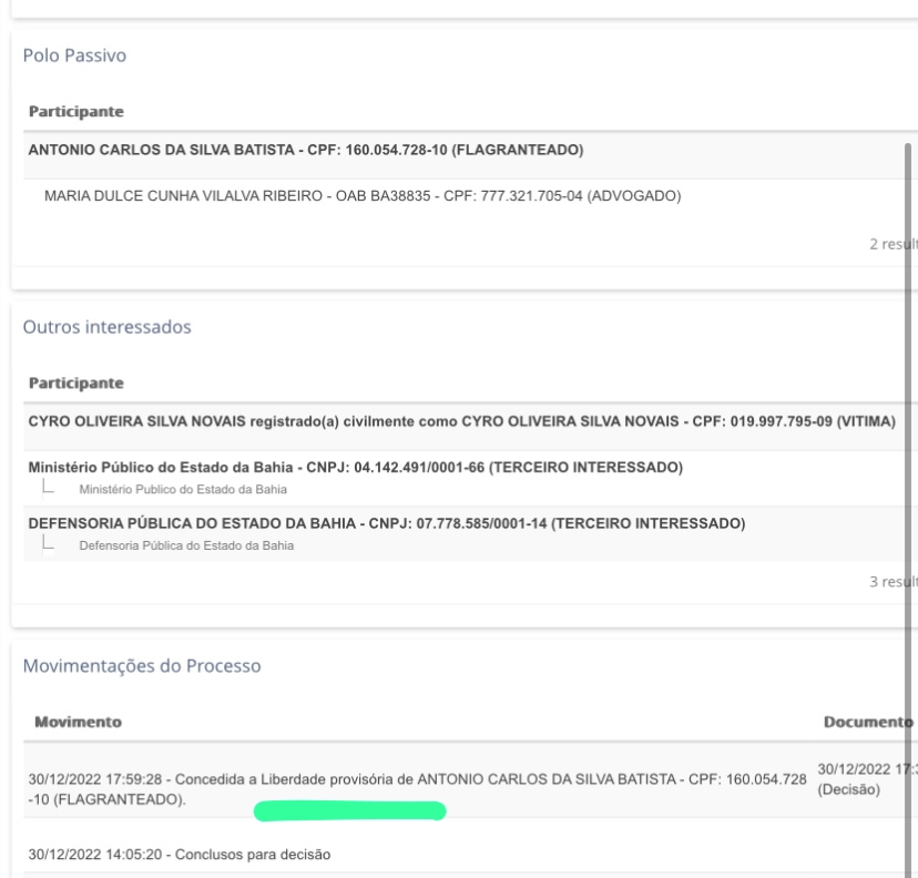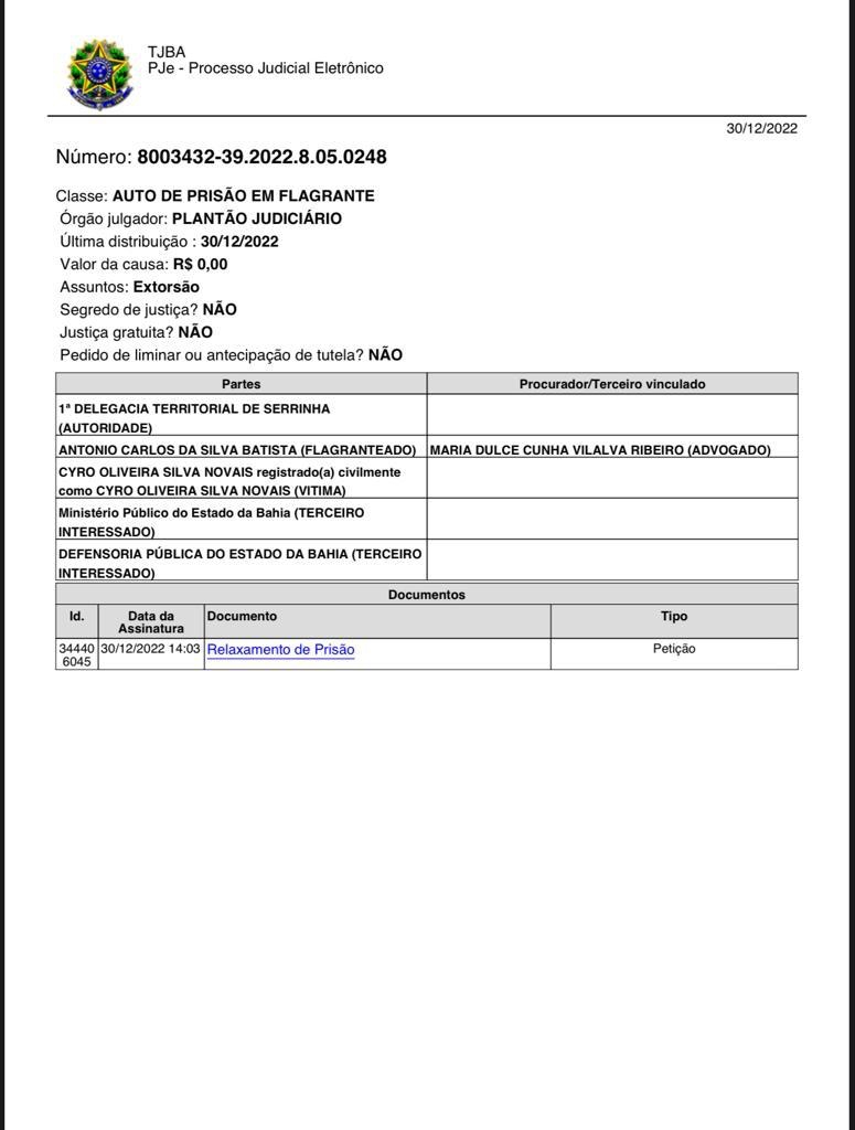 Repercutiu na manhã da última sexta-feira, 30, imagens do momento que o comunicador Antônio Carlos da Silva Batista, popularmente conhecido como Brasília, chega na garupa de uma motocicleta para receber um valor em dinheiro das mãos do procurador da Prefeitura de Serrinha, Cyro Novais que estaria sendo vítima de extorsão e o profissional da comunicação recebeu voz de prisão em flagrante. Porém, após o ocorrido, o flagranteado buscou a Defensoria Pública do Estado da Bahia, através da advogada Maria Dulce Ribeiro que deu entrada no Plantão Judiciário por volta das 14h com o pedido de Relaxamento de Prisão e lhe foi concedido.