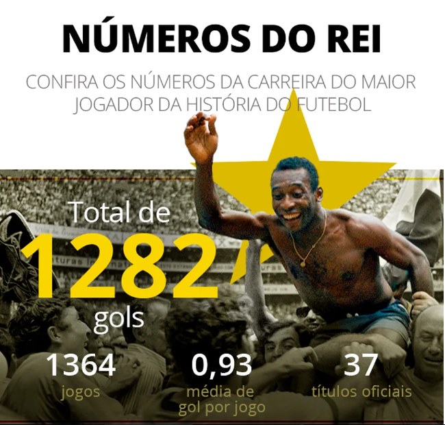 Em toda a carreira, Pelé fez 1.282 gols em 1.364 partidas na contabilização feita pelo Santos. Nas redes sociais, o Rei dizia ter feito um a mais, 1.283.
