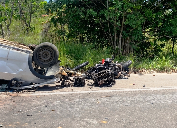 A violência do impacto foi tão forte que o carro capotou, o motor se soltou, enquanto a moto também se dividiu ao meio.
