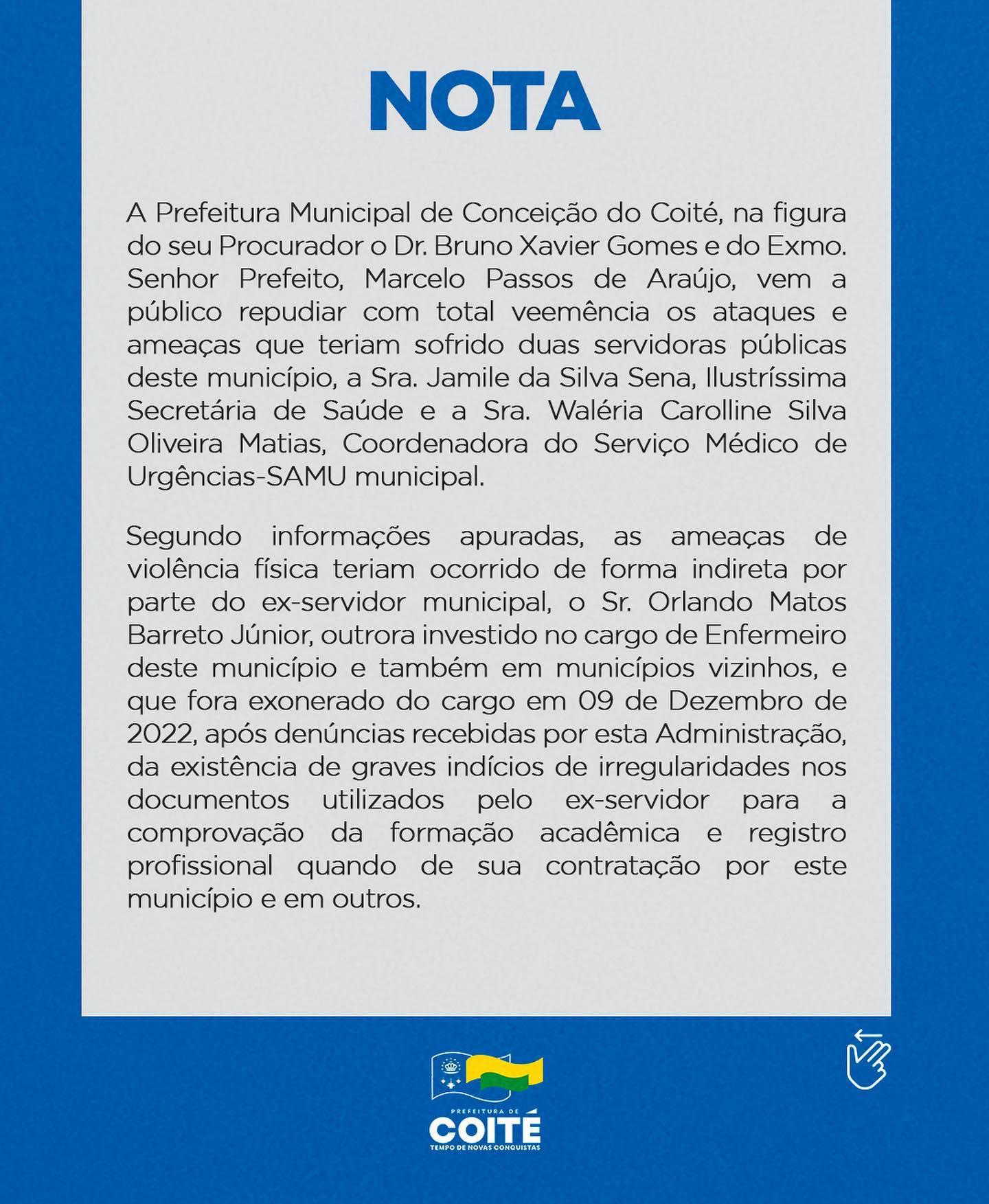 Um assunto grave porém sem muita repercussão na mídia aconteceu em Conceição do Coité no mês de dezembro do ano passado, após a exoneração do servidor público municipal Orlando Matos Barreto Júnior, lotando na secretaria de saúde, de modo especial no Serviço Móvel de Urgência (SAMU) com cargo de enfermeiro. A exoneração foi publicada no Diário Oficial do Município em 09 de dezembro de 2022.