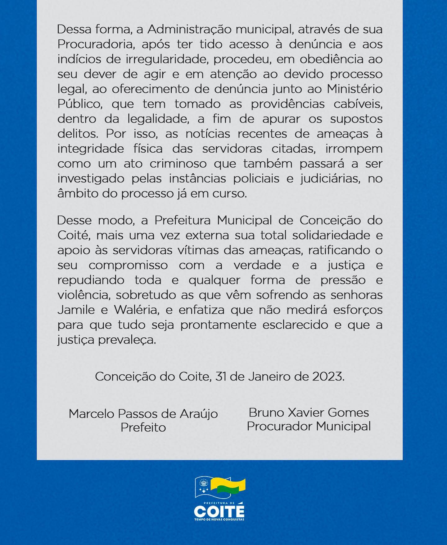 “Ser adversário político não significa querer o mal do outro. Soube que secretária de saúde do município foi ameaçada de morte por um ex assessor do grupo e que já foi registrado queixas na delegacia e a situação já se tornou pública, porque está os comentários em todos os cantos do município. O que é estranho é o silêncio do gestor e seu grupo político. Que a saúde de Coité está precisando melhorar e muito e que houve regressão, isso é fato. O Gestor e seu grupo político precisa de manifestar sobre isso, afinal é uma secretária de governo que está passando por isso. Toda minha solidariedade a cidadã Jamile. Abraços” escreveu Betão Gordiano.