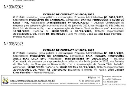 Segundo o Jornal a Nossa Voz, as publicações dos contratos foram feitas na última terça-feira dia (17). O extrato de número 0004 com valor de R$100 cem mil refere-se a empresa Dantas Produções e Eventos com objetivo da contratação da Banda Fulô de Mandacaru para apresentação na sexta-feira dia 23 de junho.