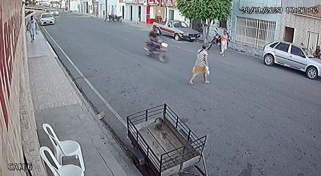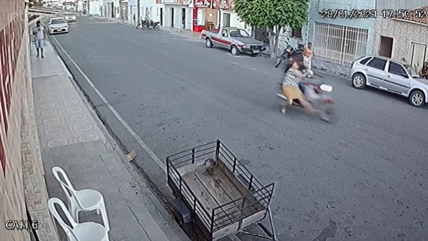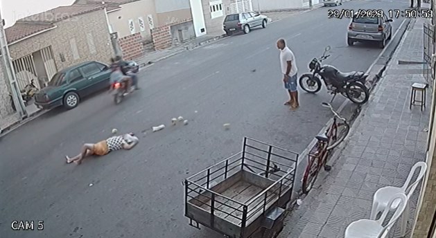 Câmeras de segurança registraram às 17h51 o momento que dona Divanete Lopes de Oliveira que irá completar 67 anos na próxima terça-feira, 31, foi atingida. O motociclista cuja identidade não foi revelada até a publicação desta reportagem, conseguiu se equilibrar e seguiu com destino ignorado com outra pessoa na garupa. As imagens são fortes e optamos por congelar o momento.